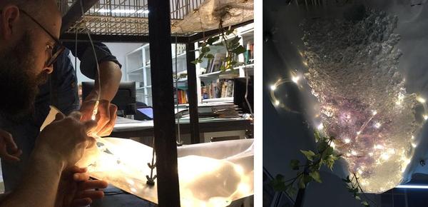 La intervención lumínica tendrá como objeto principal una lámpara inflable en forma de nube (4mx1.5mx1.2m) que contendrá 150 puntos de luz led. Este objeto irá acompañado de otros objetos domésticos iluminados que relacionen la celebración de la Navidad con los 4 elementos: Tierra, Aire, Fuego y